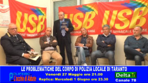 Anteprima della trasmissione televisiva “Polifemo – L’occhio di Abbate”, in onda venerdì 27 maggio alle ore 21.00 su Delta Tv (canale 78 del digitale terrestre, visibile in tutta la Puglia ed in tutta la Basilicata), avente ad oggetto le problematiche del Corpo di Polizia Locale di Taranto. Ospiti: Piero Bitetti (presidente del Consiglio Comunale di Taranto), Capitano Raffaele Maragno (Responsabile servizio Reparto Mobile della Polizia Locale di Taranto), Angelo Ferrarese (responsabile USB Polizia Locale di Taranto), Marcello La Gioia (Vice Brigadiere Polizia Locale di Taranto, delegato USB), Capitano Antonio Lampedecchia (responsabile USB Enti Locali Bari). Ecco nel video alcuni dei momenti più significativi della trasmissione. Puntata da non perdere assolutamente, buona visione!