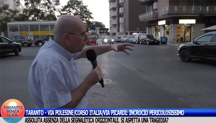 TARANTO – VIA POLESINE/CORSO ITALIA/VIA PICARDI:INCROCIO PERICOLOSO. ASSENZA SEGNALETICA ORIZZONTALE